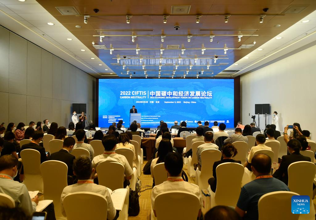 Photo taken on Sept. 3, 2022 shows a scene of the 2022 China Economic Development Forum on Carbon Neutrality held at the China National Convention Center in Beijing, capital of China. (Xinhua/Lu Peng)
