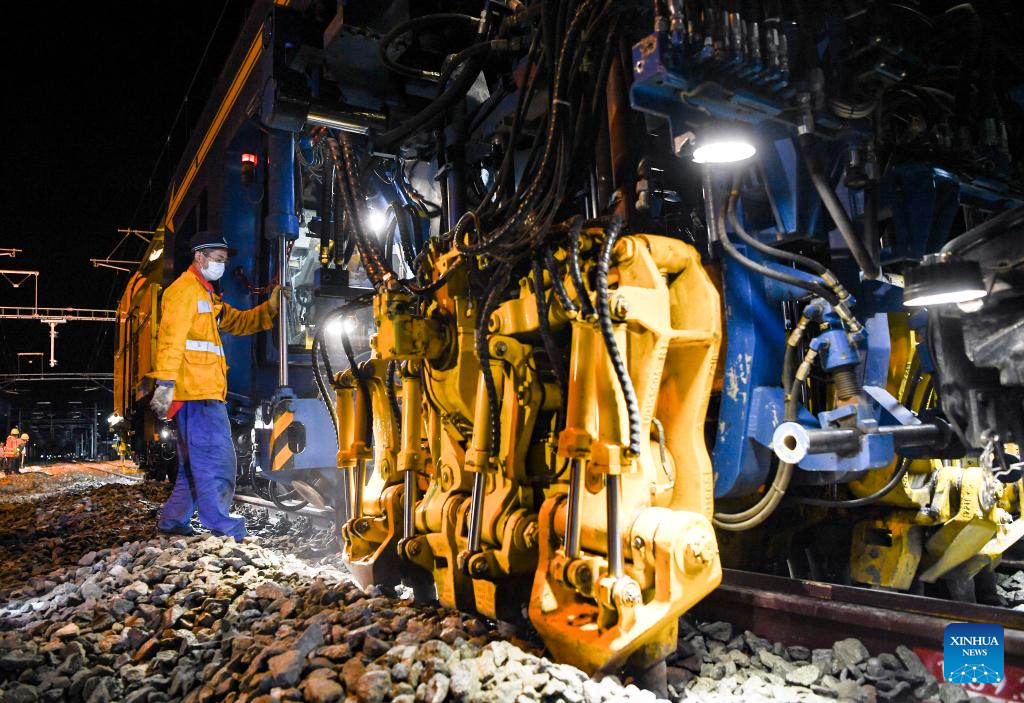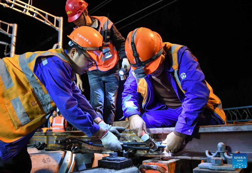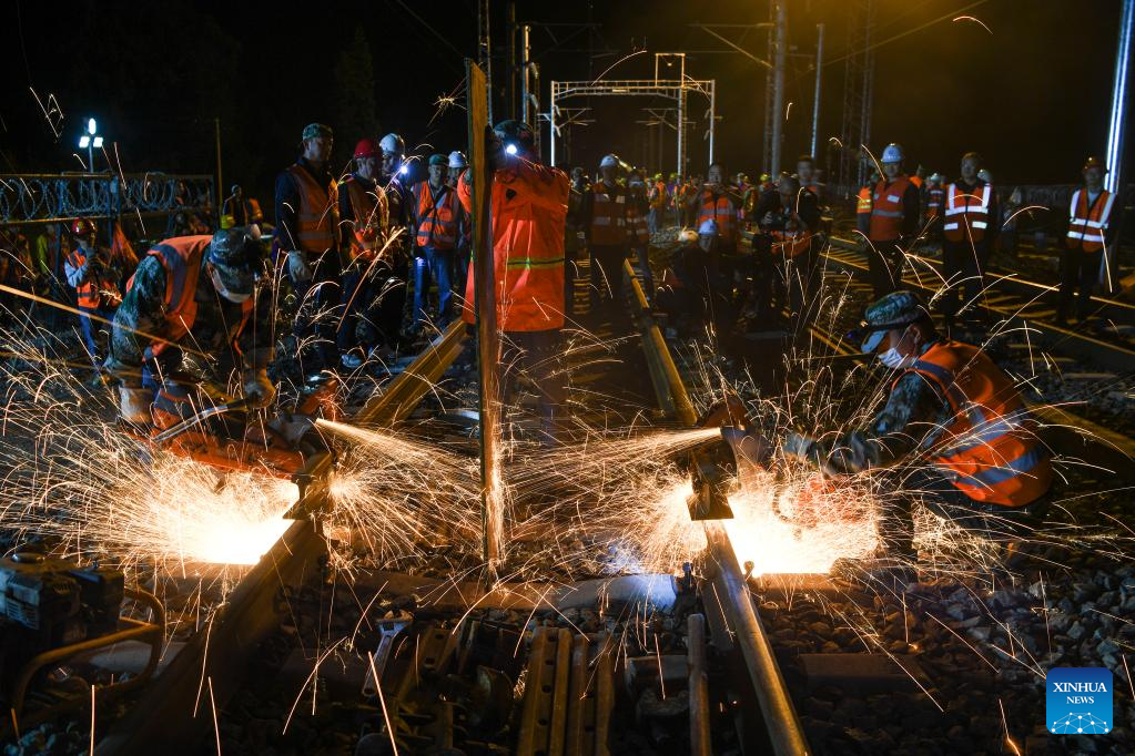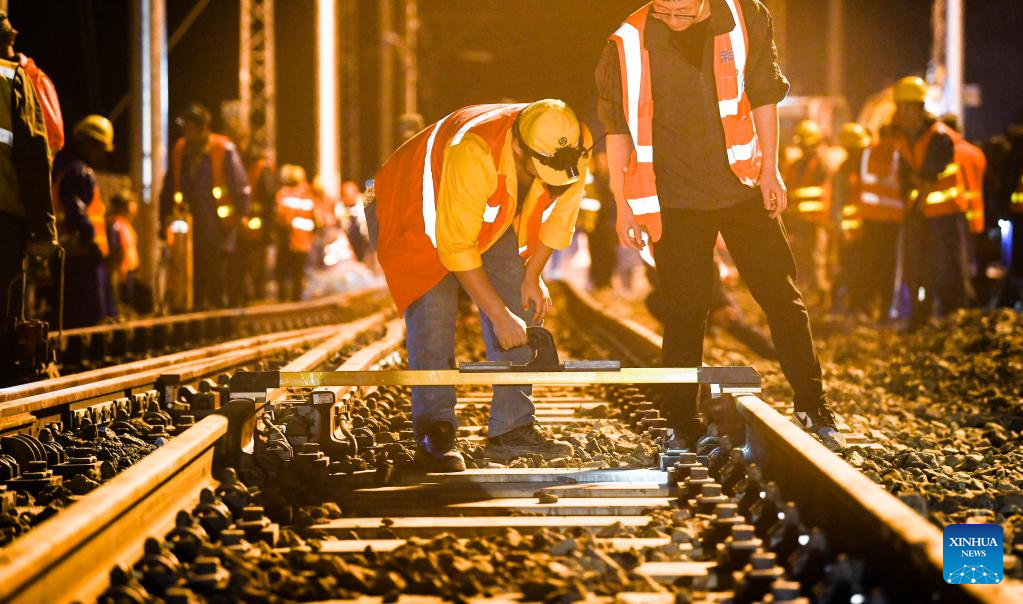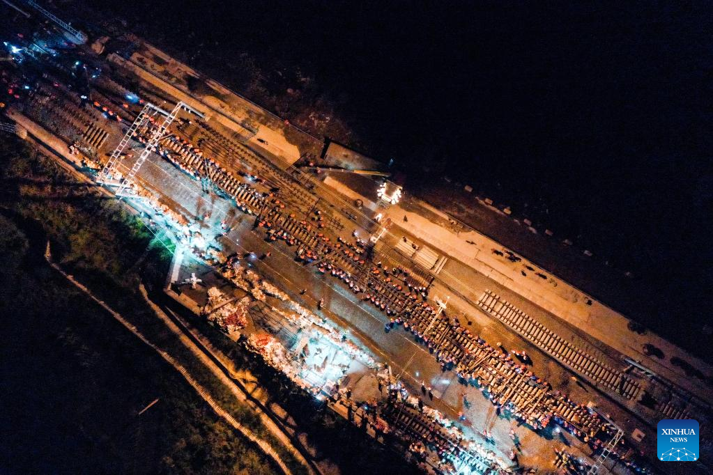Staff members work at the construction site of Shazi railway station expansion project in southwest China's Chongqing on Sept. 2, 2022. The construction of 6 turnouts in Shazi railway station of Chongqing-Lichuan railway line completed recently, accelerating the expansion of this station. (Xinhua/Wang Quanchao)
