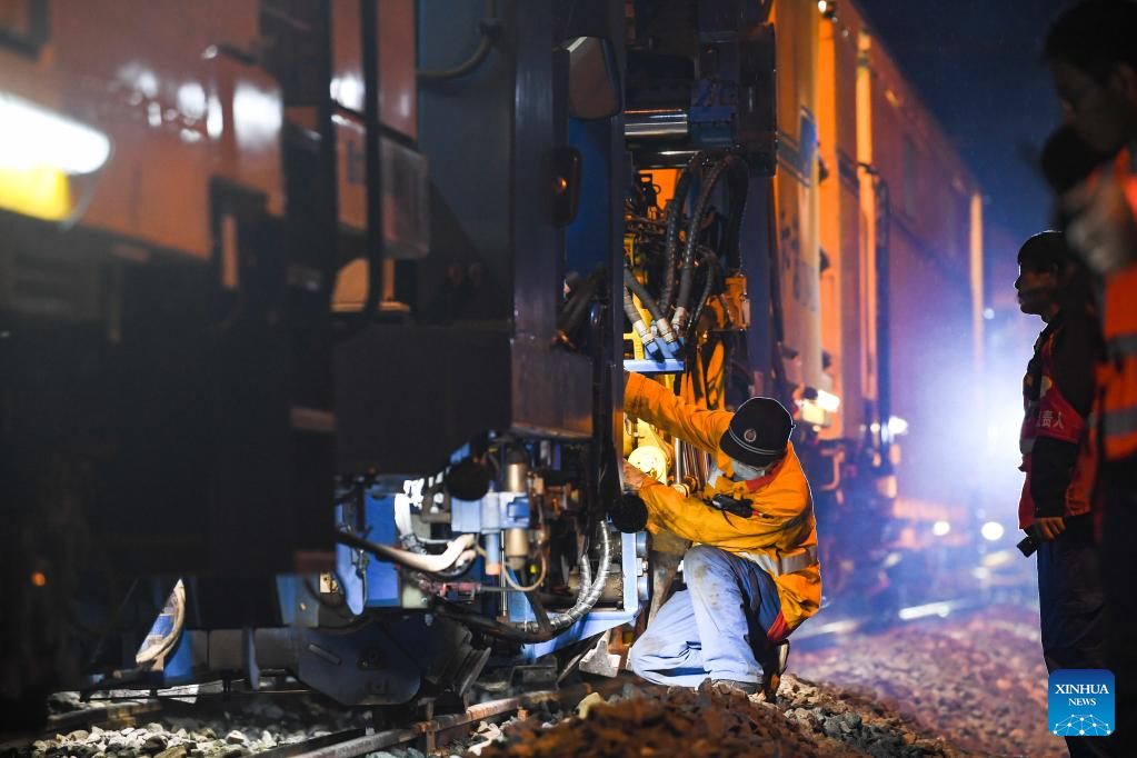 A staff member works at the construction site of Shazi railway station expansion project in southwest China's Chongqing on Sept. 3, 2022. The construction of 6 turnouts in Shazi railway station of Chongqing-Lichuan railway line completed recently, accelerating the expansion of this station. (Xinhua/Wang Quanchao)