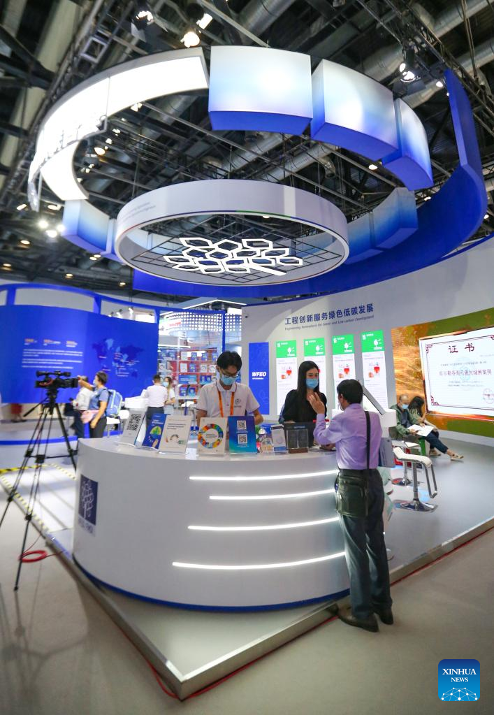 People visit the booth of the World Federation of Engineering Organizations (WFEO) at the China National Convention Center during the 2022 China International Fair for Trade in Services (CIFTIS) in Beijing, capital of China, Sept. 3, 2022. A total of 71 countries and international organizations attend the 2022 CIFTIS held in Beijing from Aug. 31 to Sept. 5. This year's CIFTIS, themed "Cooperate for Better Development, Innovate for a Greener Future," features increased internationalization with the participation of more than 2,400 companies, including over 400 Global Fortune 500 companies and industry-leading enterprises. (Xinhua/Zhang Fan)
