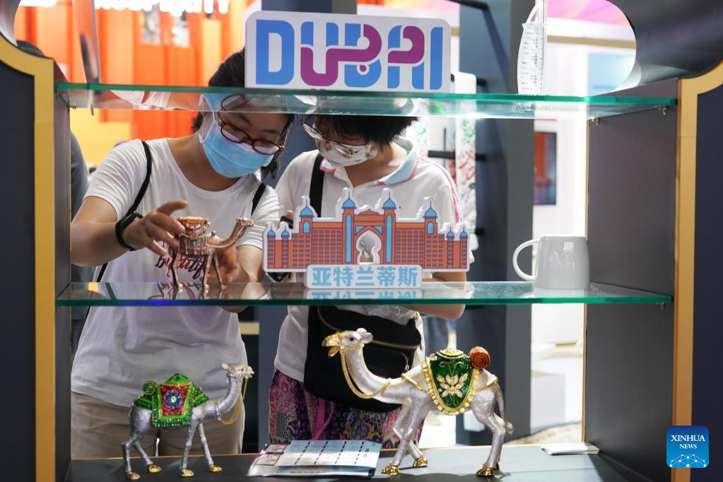 People visit the booth of the United Arab Emirates (UAE) at the China National Convention Center during the 2022 China International Fair for Trade in Services (CIFTIS) in Beijing, capital of China, Sept. 4, 2022. A total of 71 countries and international organizations attend the 2022 CIFTIS held in Beijing from Aug. 31 to Sept. 5. This year's CIFTIS, themed "Cooperate for Better Development, Innovate for a Greener Future," features increased internationalization with the participation of more than 2,400 companies, including over 400 Global Fortune 500 companies and industry-leading enterprises. (Xinhua/Ren Chao)