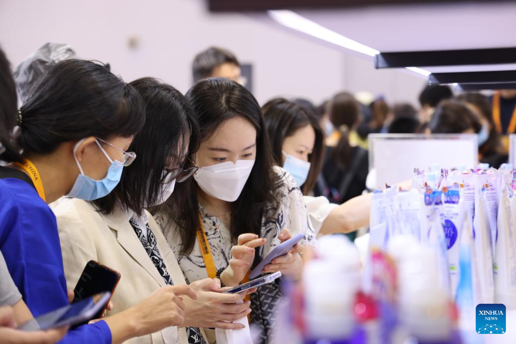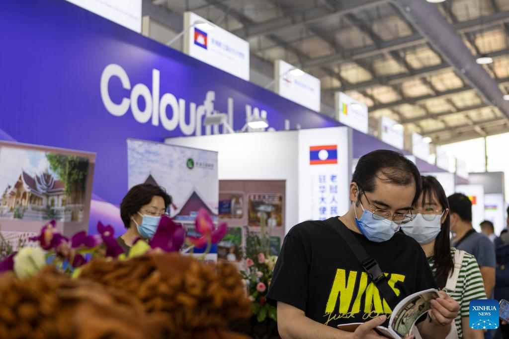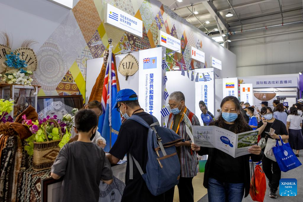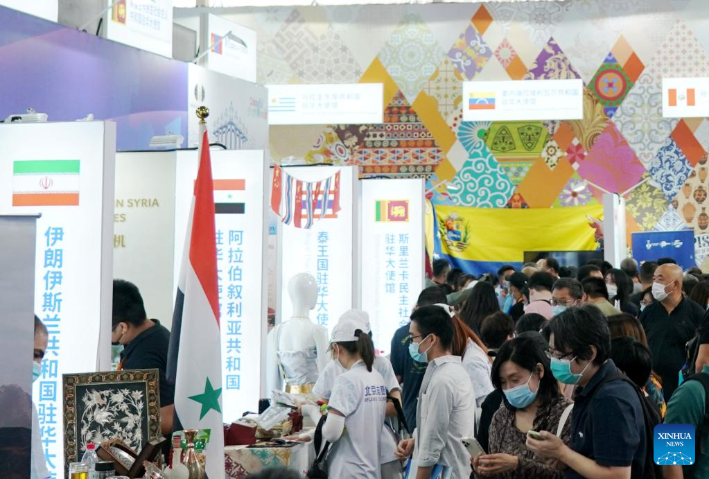 People learn about products from different countries during an exhibition of Cultural and Tourism Services at the Shougang Park during the 2022 China International Fair for Trade in Services (CIFTIS) in Beijing, capital of China, Sept. 1, 2022. A total of 71 countries and international organizations attend the 2022 CIFTIS held in Beijing from Aug. 31 to Sept. 5. This year's CIFTIS, themed "Cooperate for Better Development, Innovate for a Greener Future," features increased internationalization with the participation of more than 2,400 companies, including over 400 Global Fortune 500 companies and industry-leading enterprises. (Xinhua/Zhang Chenlin)