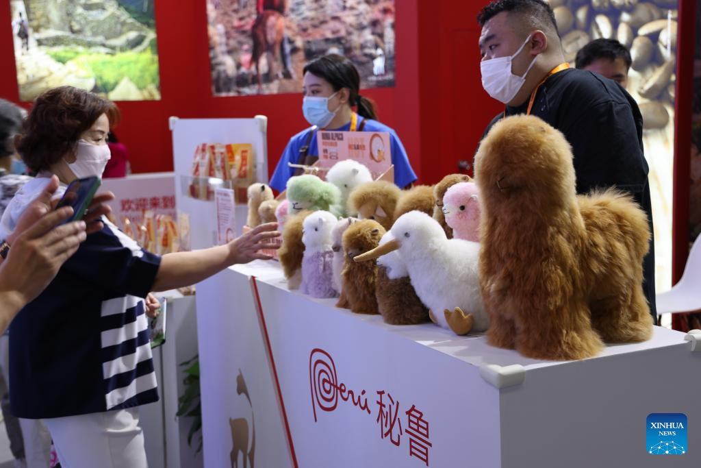 People visit the booth of Peru at the China National Convention Center during the 2022 China International Fair for Trade in Services (CIFTIS) in Beijing, capital of China, Sept. 3, 2022. A total of 71 countries and international organizations attend the 2022 CIFTIS held in Beijing from Aug. 31 to Sept. 5. This year's CIFTIS, themed "Cooperate for Better Development, Innovate for a Greener Future," features increased internationalization with the participation of more than 2,400 companies, including over 400 Global Fortune 500 companies and industry-leading enterprises. (Xinhua/Qi Xiaoyi)