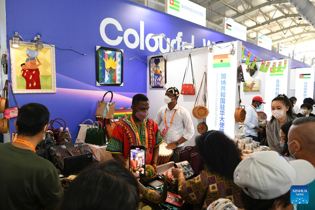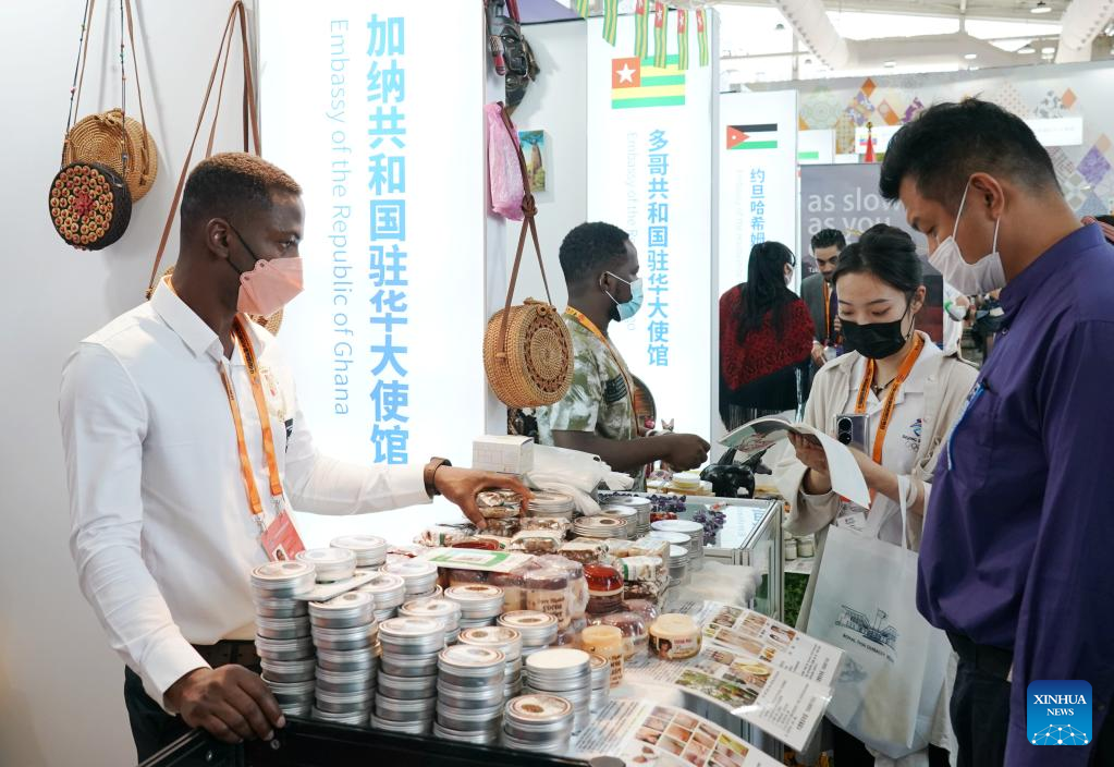 People visit the booth of the embassy of the Rupublic of Ghana at the Shougang Park during the 2022 China International Fair for Trade in Services (CIFTIS) in Beijing, capital of China, Sept. 4, 2022. A total of 71 countries and international organizations attend the 2022 CIFTIS held in Beijing from Aug. 31 to Sept. 5. This year's CIFTIS, themed "Cooperate for Better Development, Innovate for a Greener Future," features increased internationalization with the participation of more than 2,400 companies, including over 400 Global Fortune 500 companies and industry-leading enterprises. (Xinhua/Han Xu)