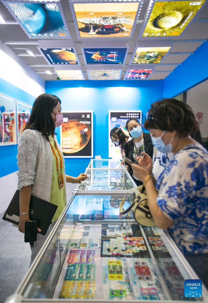 People visit the booth of the United Nations Postal Administration (UNPA) at the China National Convention Center during the 2022 China International Fair for Trade in Services (CIFTIS) in Beijing, capital of China, Sept. 3, 2022. A total of 71 countries and international organizations attend the 2022 CIFTIS held in Beijing from Aug. 31 to Sept. 5. This year's CIFTIS, themed "Cooperate for Better Development, Innovate for a Greener Future," features increased internationalization with the participation of more than 2,400 companies, including over 400 Global Fortune 500 companies and industry-leading enterprises. (Xinhua/Zhang Fan)