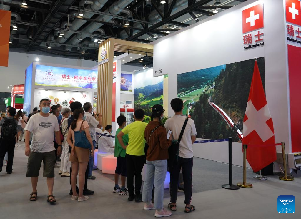 People visit the booth of Switzerland at the China National Convention Center during the 2022 China International Fair for Trade in Services (CIFTIS) in Beijing, capital of China, Sept. 4, 2022. A total of 71 countries and international organizations attend the 2022 CIFTIS held in Beijing from Aug. 31 to Sept. 5. This year's CIFTIS, themed "Cooperate for Better Development, Innovate for a Greener Future," features increased internationalization with the participation of more than 2,400 companies, including over 400 Global Fortune 500 companies and industry-leading enterprises. (Xinhua/Ren Chao)
