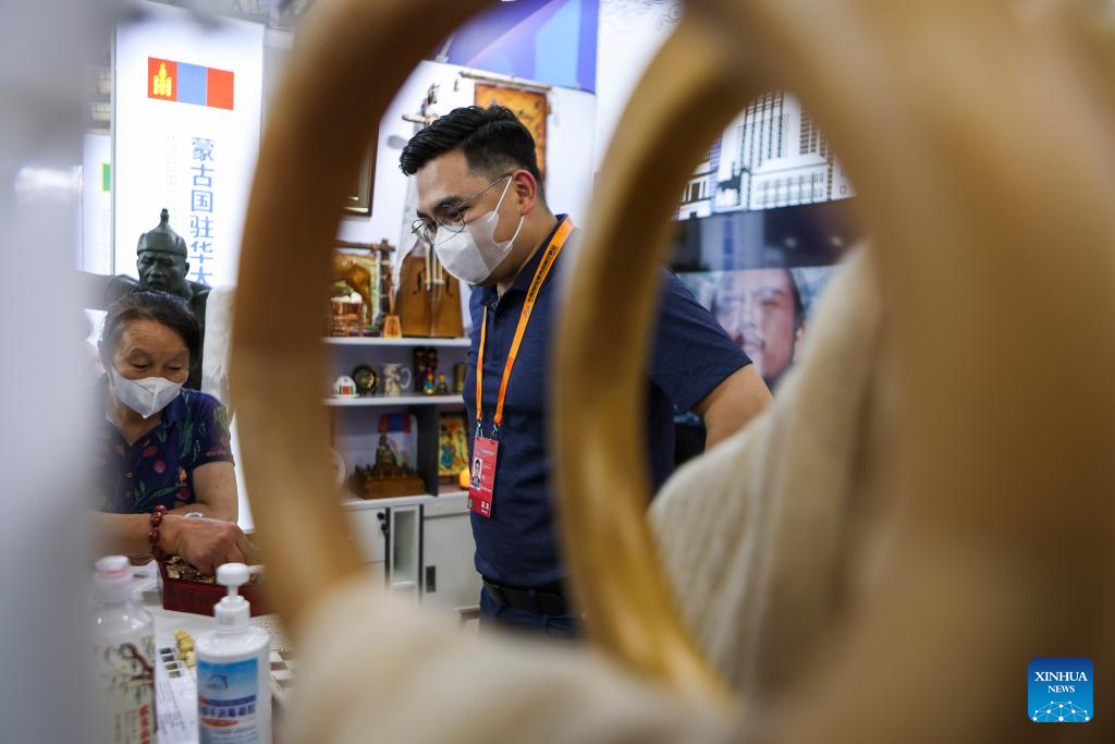 People visit the booth of the embassy of Mongolia at the Shougang Park during the 2022 China International Fair for Trade in Services (CIFTIS) in Beijing, capital of China, Sept. 4, 2022. A total of 71 countries and international organizations attend the 2022 CIFTIS held in Beijing from Aug. 31 to Sept. 5. This year's CIFTIS, themed "Cooperate for Better Development, Innovate for a Greener Future," features increased internationalization with the participation of more than 2,400 companies, including over 400 Global Fortune 500 companies and industry-leading enterprises. (Xinhua/Hao Zhao)