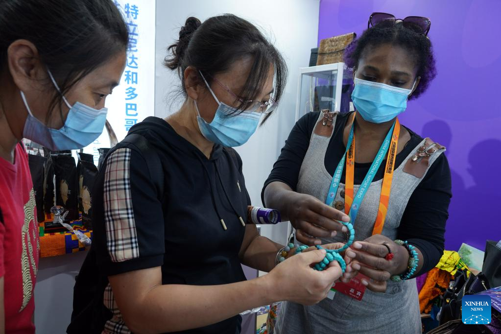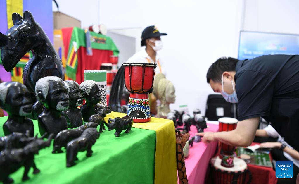 People visit the booth of Zimbabwe at the Shougang Park during the 2022 China International Fair for Trade in Services (CIFTIS) in Beijing, capital of China, Sept. 4, 2022. A total of 71 countries and international organizations attend the 2022 CIFTIS held in Beijing from Aug. 31 to Sept. 5. This year's CIFTIS, themed "Cooperate for Better Development, Innovate for a Greener Future," features increased internationalization with the participation of more than 2,400 companies, including over 400 Global Fortune 500 companies and industry-leading enterprises. (Xinhua/Han Xu)
