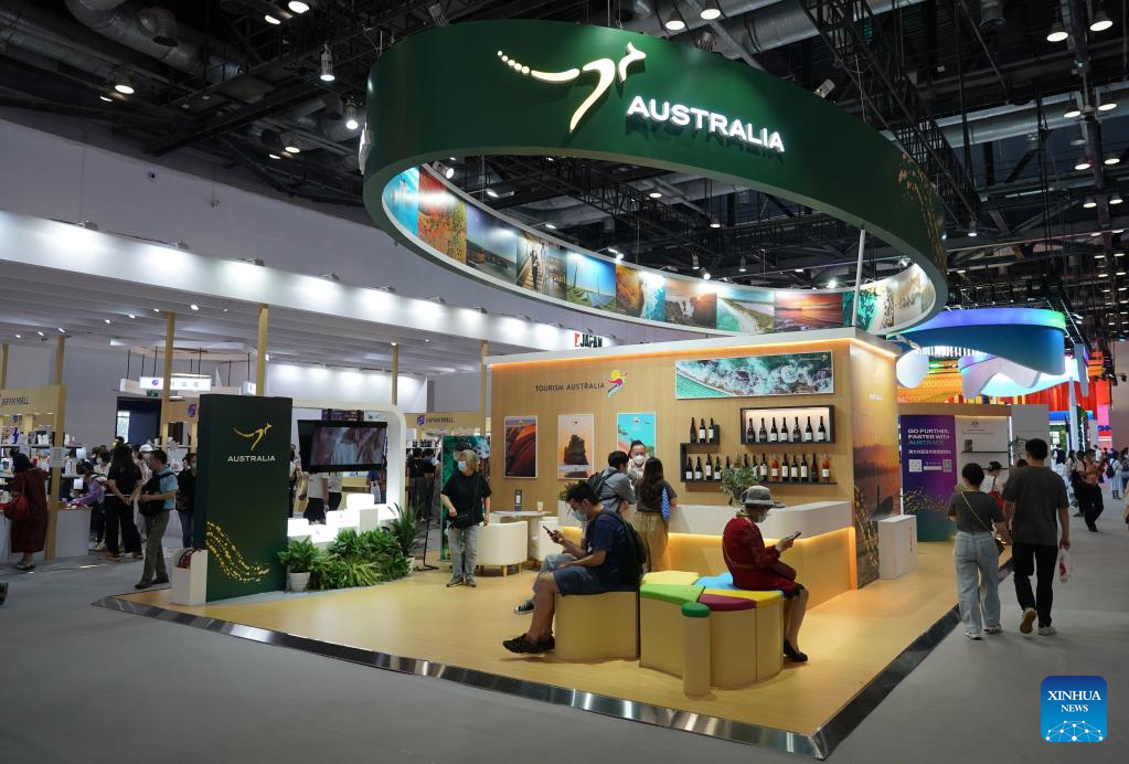 People visit the booth of Australia at the China National Convention Center during the 2022 China International Fair for Trade in Services (CIFTIS) in Beijing, capital of China, Sept. 4, 2022. A total of 71 countries and international organizations attend the 2022 CIFTIS held in Beijing from Aug. 31 to Sept. 5. This year's CIFTIS, themed "Cooperate for Better Development, Innovate for a Greener Future," features increased internationalization with the participation of more than 2,400 companies, including over 400 Global Fortune 500 companies and industry-leading enterprises. (Xinhua/Ren Chao)
