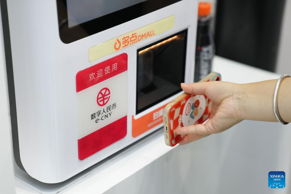 A staff member demonstrates the e-CNY (digital yuan) payment at an exhibition of financial services during the 2022 China International Fair for Trade in Services (CIFTIS) at the Shougang Park in Beijing, capital of China, Sept. 4, 2022. (Xinhua/Ju Huanzong)