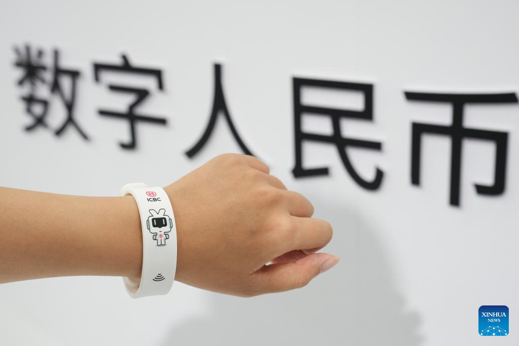 A staff member demonstrates a wearable payment device for e-CNY (digital yuan) at an exhibition of financial services during the 2022 China International Fair for Trade in Services (CIFTIS) at the Shougang Park in Beijing, capital of China, Sept. 4, 2022. (Xinhua/Ju Huanzong)