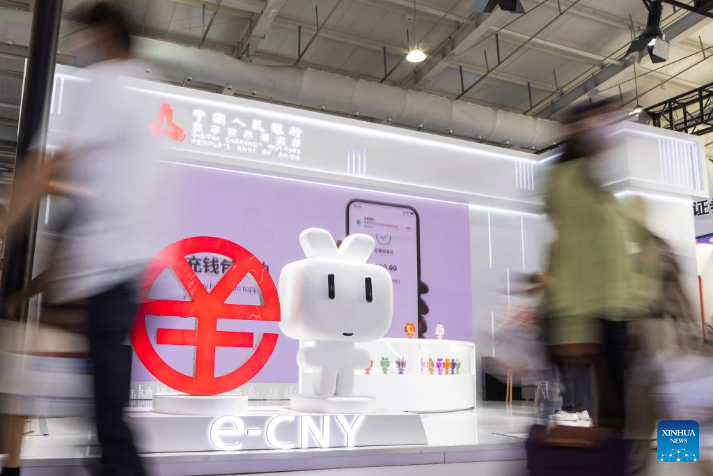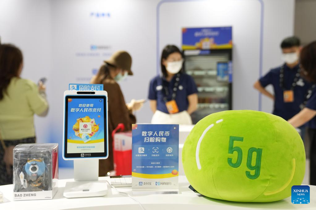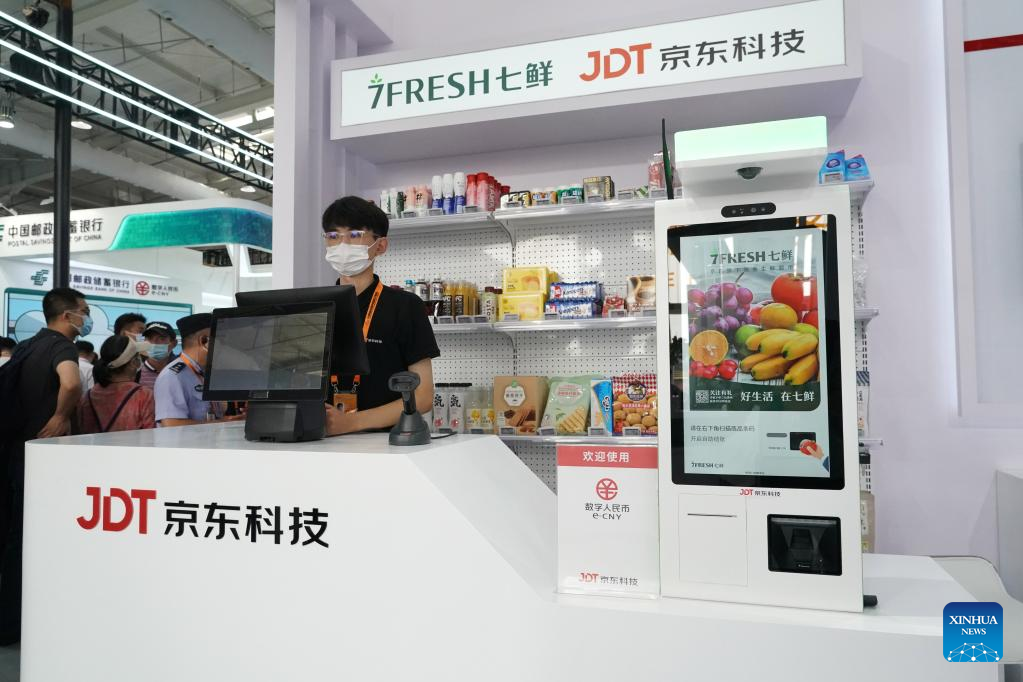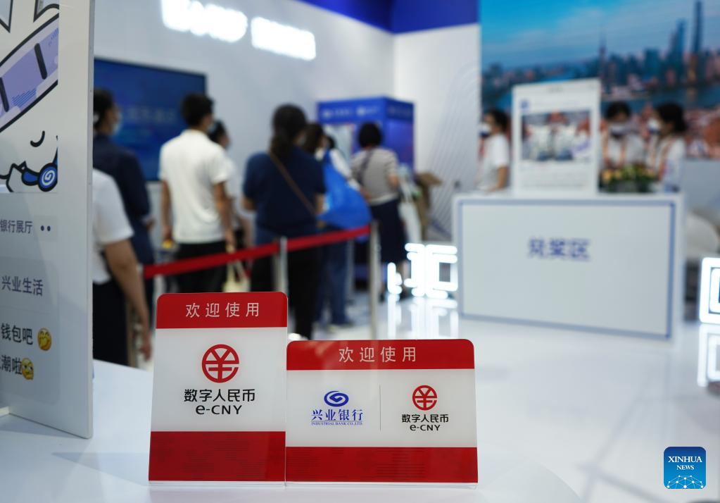 Photo taken on Sept. 4, 2022 shows a booth for visitors to experience the e-CNY (digital yuan) payment at an exhibition of financial services during the 2022 China International Fair for Trade in Services (CIFTIS) at the Shougang Park in Beijing, capital of China. (Xinhua/Ren Chao)