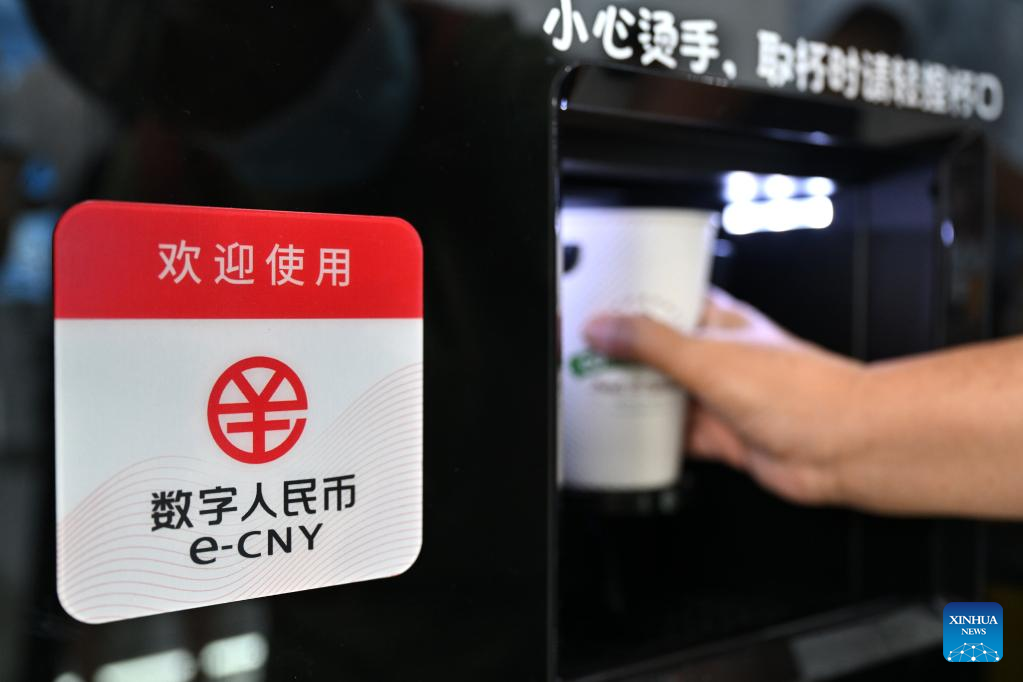 A visitor buys a cup of coffee with e-CNY (digital yuan) at an exhibition of financial services during the 2022 China International Fair for Trade in Services (CIFTIS) at the Shougang Park in Beijing, capital of China, Sept. 4, 2022. (Xinhua/Li Xin)