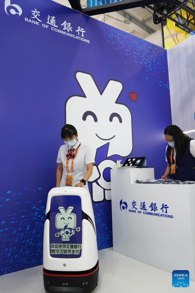 A staff member operates a robot for e-CNY (digital yuan) payment at an exhibition of financial services during the 2022 China International Fair for Trade in Services (CIFTIS) at the Shougang Park in Beijing, capital of China, Sept. 4, 2022. (Xinhua/Jin Haoyuan)