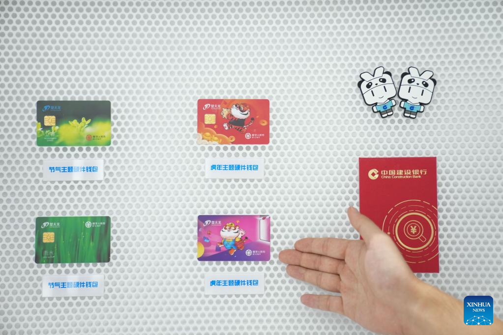 Photo taken on Sept. 4, 2022 shows e-CNY (digital yuan) payment cards at an exhibition of financial services during the 2022 China International Fair for Trade in Services (CIFTIS) at the Shougang Park in Beijing, capital of China. (Xinhua/Ju Huanzong)