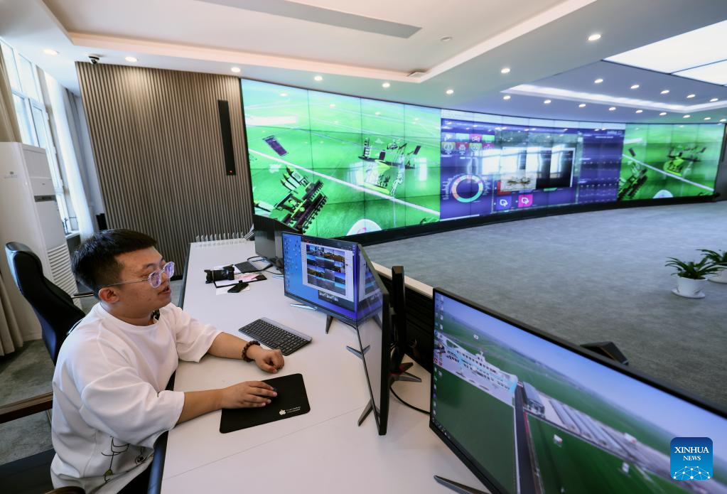 A staff member operates at the modern agricultural information service center of a paddy rice technology demonstration park in Fujin City of northeast China's Heilongjiang Province, on Sept. 2, 2022. Cutting-edge information technologies including the Internet-of-Things and cloud-computing have been adopted for breeding management, water-saving irrigation, weather monitoring, grain growth tracking, as well as pest and weed control at the demonstration park to improve both quantity and quality of rice produce. (Xinhua/Lan Hongguang)