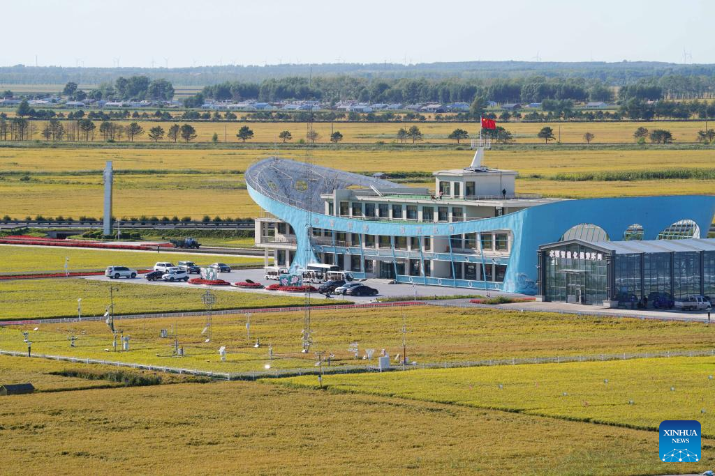 Photo taken on Sept. 2, 2022 shows the modern agricultural information service center of a paddy rice technology demonstration park in Fujin City of northeast China's Heilongjiang Province. Cutting-edge information technologies including the Internet-of-Things and cloud-computing have been adopted for breeding management, water-saving irrigation, weather monitoring, grain growth tracking, as well as pest and weed control at the demonstration park to improve both quantity and quality of rice produce. (Xinhua/Wang Jianwei)