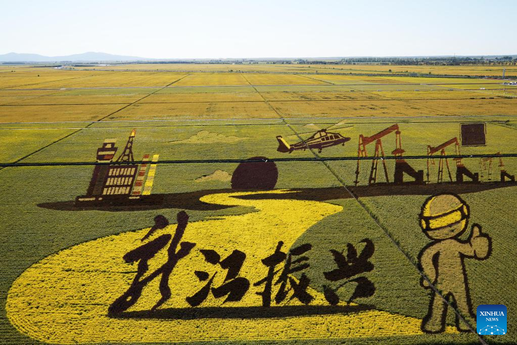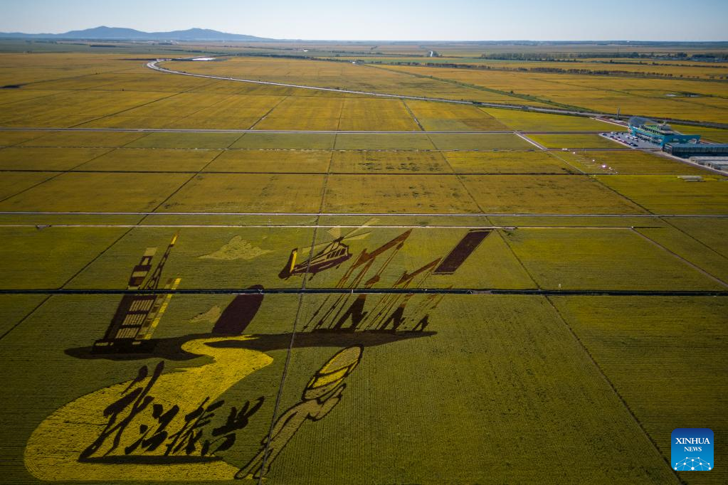 Photo taken on Sept. 2, 2022 shows an art creation made up of living plants of different colors in a paddy rice technology demonstration park in Fujin City of northeast China's Heilongjiang Province. Cutting-edge information technologies including the Internet-of-Things and cloud-computing have been adopted for breeding management, water-saving irrigation, weather monitoring, grain growth tracking, as well as pest and weed control at the demonstration park to improve both quantity and quality of rice produce. (Xinhua/Wang Jianwei)