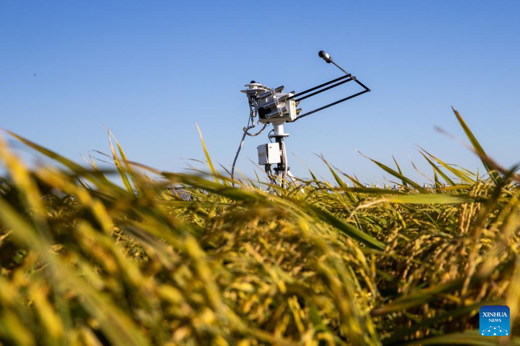 Photo taken on Sept. 2, 2022 shows a weather monitoring device in a paddy rice technology demonstration park in Fujin City of northeast China's Heilongjiang Province. Cutting-edge information technologies including the Internet-of-Things and cloud-computing have been adopted for breeding management, water-saving irrigation, weather monitoring, grain growth tracking, as well as pest and weed control at the demonstration park to improve both quantity and quality of rice produce. (Xinhua/Zhang Tao)