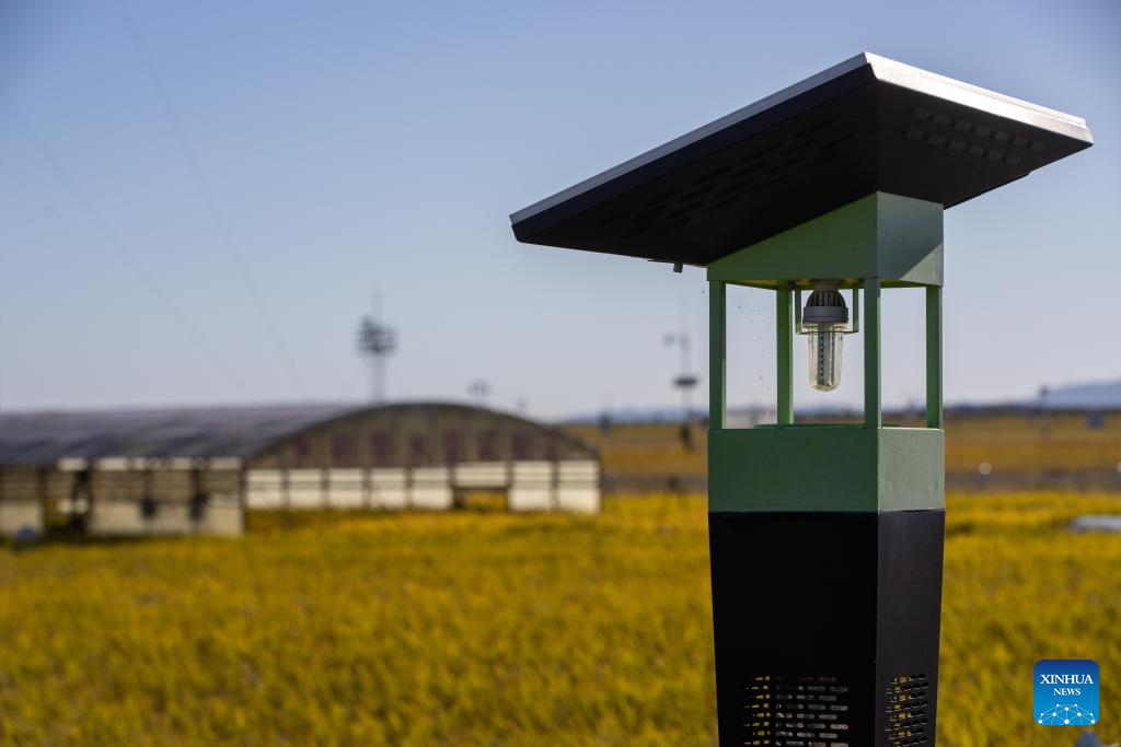 Photo taken on Sept. 2, 2022 shows a pest-control device in a paddy rice technology demonstration park in Fujin City of northeast China's Heilongjiang Province. Cutting-edge information technologies including the Internet-of-Things and cloud-computing have been adopted for breeding management, water-saving irrigation, weather monitoring, grain growth tracking, as well as pest and weed control at the demonstration park to improve both quantity and quality of rice produce. (Xinhua/Zhang Tao)