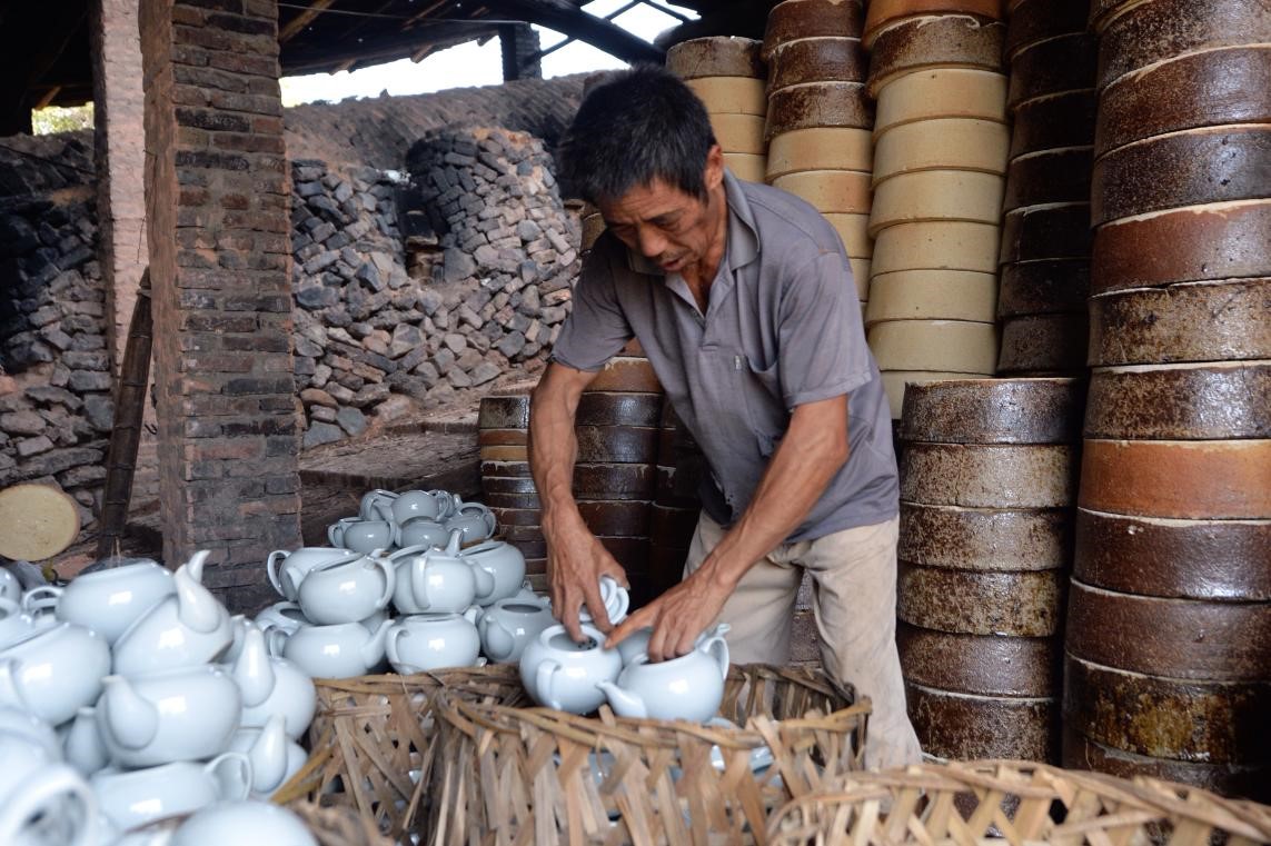 A worker packs porcelain pots in a klin in Dehua county, Quanzhou, southeast China's Fujian province. (People's Daily Online/Weng Qiyu, Xie Xi)
