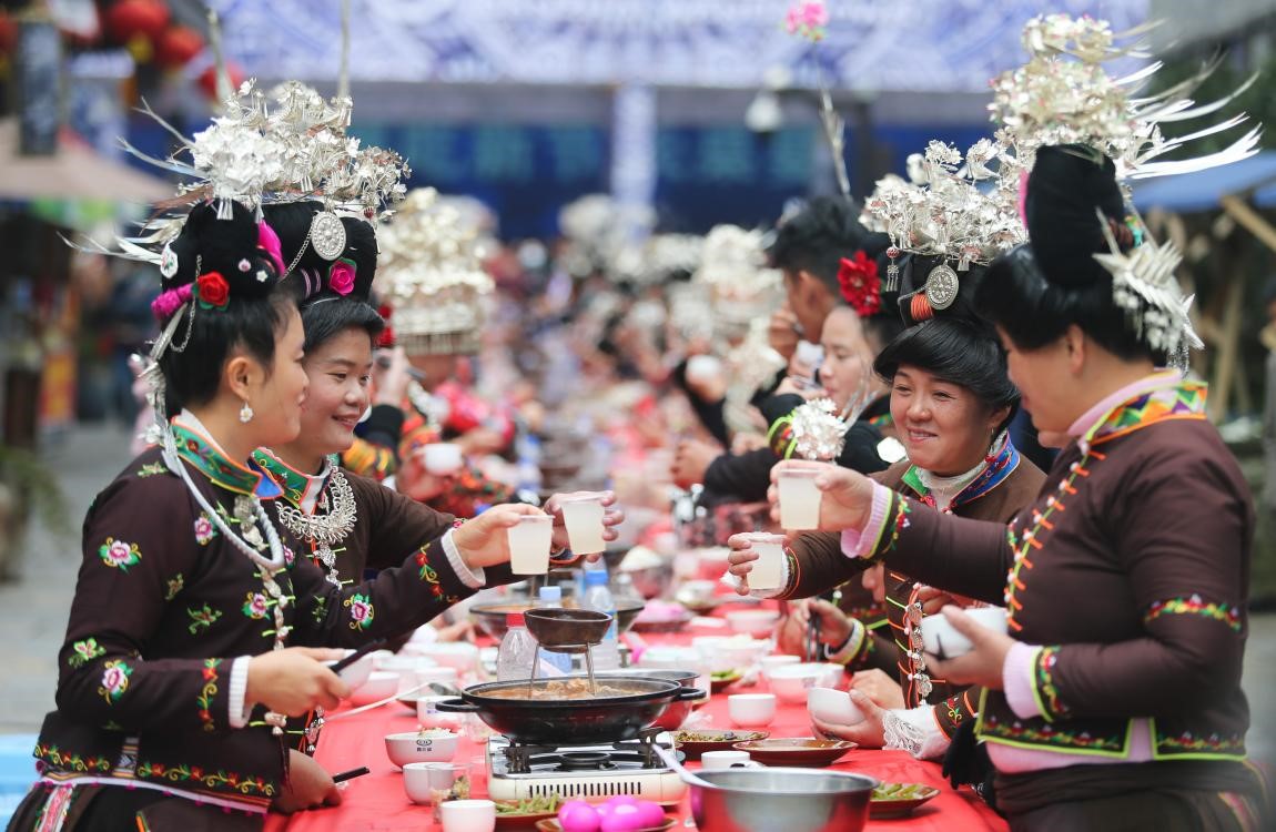 Villagers of Miao ethnic group make a toast during a traditional Miao ethnic harvest festival in a village in southwest China's Guizhou province, Oct. 18, 2020. (People's Daily Online/ Zhang Hui)