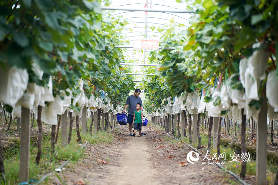 Tourists pick grapes at Liu Fuping's grape garden in Jianqiao village, Langxi county, Xuancheng city, east China's Anhui Province. (People's Daily Online/Wang Rui)