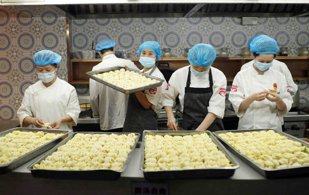 Hotel employees make steamed buns for customers in Urumqi, Xinjiang Uygur autonomous region, on Sunday. Hotels, shopping malls, restaurants and supermarkets are gradually reopening as the COVID-19 situation improves and the city eases its restrictions. CHINA DAILY