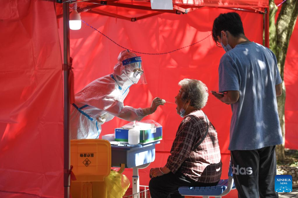 A medical worker takes a swab sample from a resident for nucleic acid test at a community testing site for COVID-19 in Yunyan District of Guiyang, southwest China's Guizhou Province, Sept. 5, 2022. (Xinhua/Yang Wenbin)