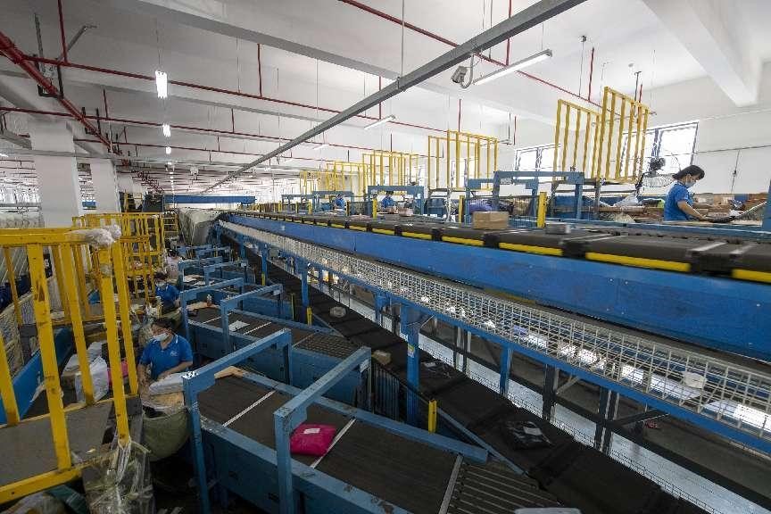 Workers are sorting express delivery parcels in a workshop of ZTO Express in Malu township, Cenxi, south China's Guangxi Zhuang autonomous region, Aug. 4, 2022. (People's Daily Online/He Huawen)