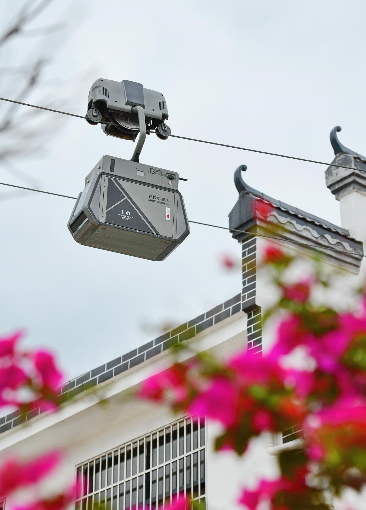 An intelligent express delivery robot runs on a cable in Anyuan county, Ganzhou, east China's Jiangxi province, carrying agricultural produce, April 14, 2022. (People's Daily Online/Zhu Haipeng)