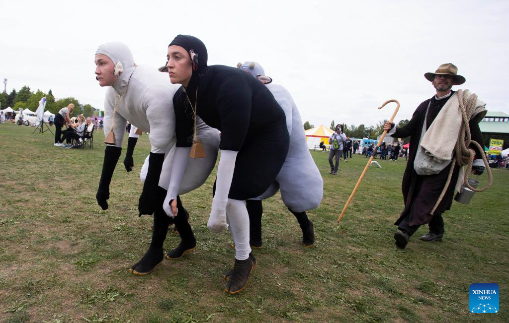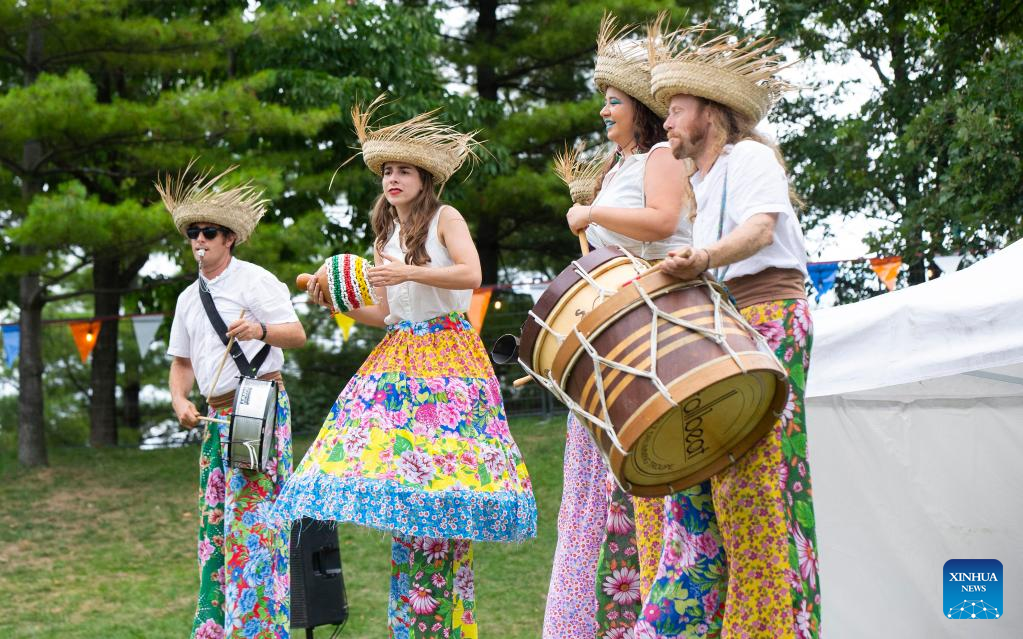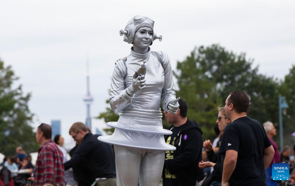 Dressed-up buskers perform during the 2022 Toronto International BuskerFest in Toronto, Canada, on Sept. 5, 2022. This annual event was held here from Sept. 2 to 5 with dozens of buskers from around the world participating the activity. (Photo by Zou Zheng/Xinhua)