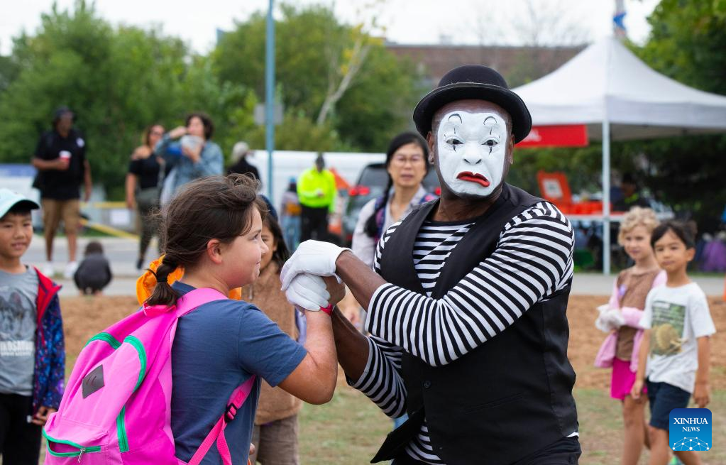 A male mime actor performs with a girl during the 2022 Toronto International BuskerFest in Toronto, Canada, on Sept. 5, 2022. This annual event was held here from Sept. 2 to 5 with dozens of buskers from around the world participating the activity. (Photo by Zou Zheng/Xinhua)