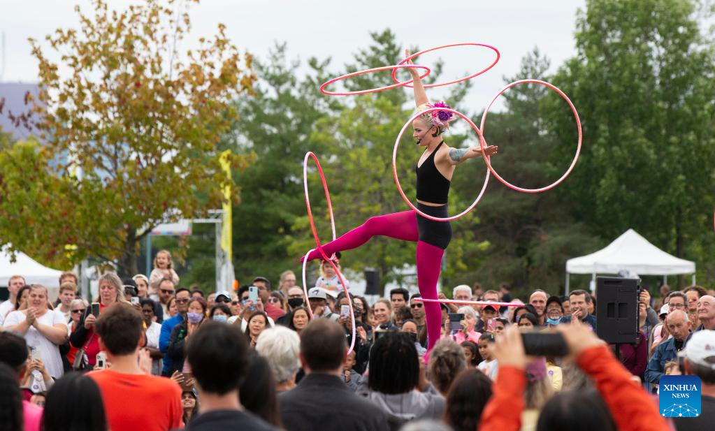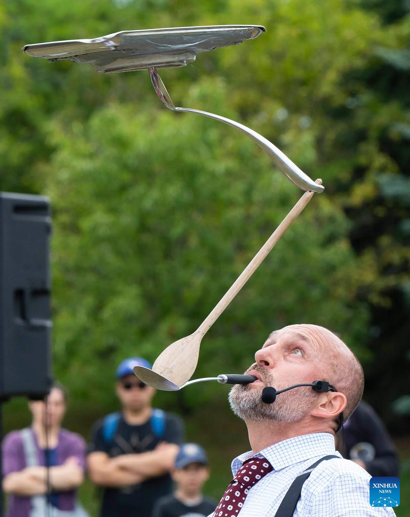 A busker performs during the 2022 Toronto International BuskerFest in Toronto, Canada, on Sept. 5, 2022. This annual event was held here from Sept. 2 to 5 with dozens of buskers from around the world participating the activity. (Photo by Zou Zheng/Xinhua)