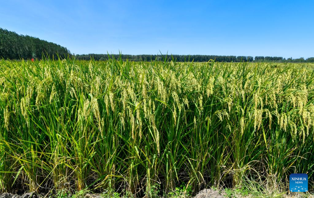 Photo taken on Sept. 6, 2022 shows the "giant rice", a variety of hybrid rice, in Dongbaizhuang Village of Dongjituo Township, Ninghe District of north China's Tianjin. About 100 mu (about 6.67 hectares) of the "giant rice" was sown in late May and is expected to enter the harvest season in October. (Xinhua/Sun Fanyue)