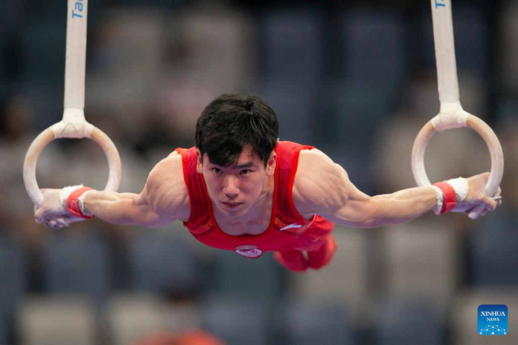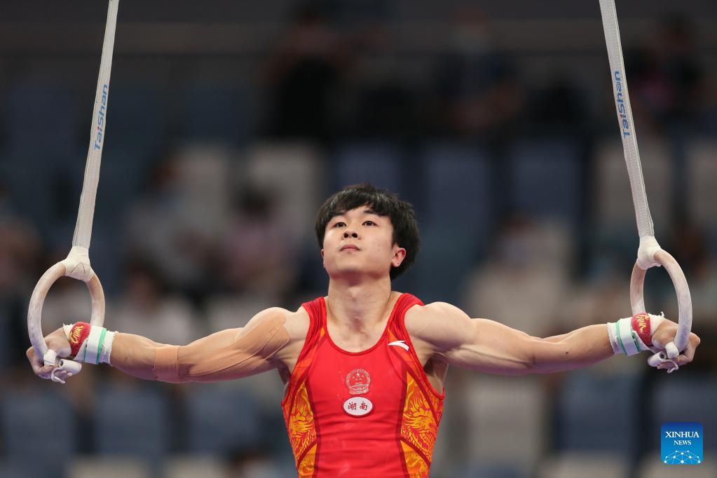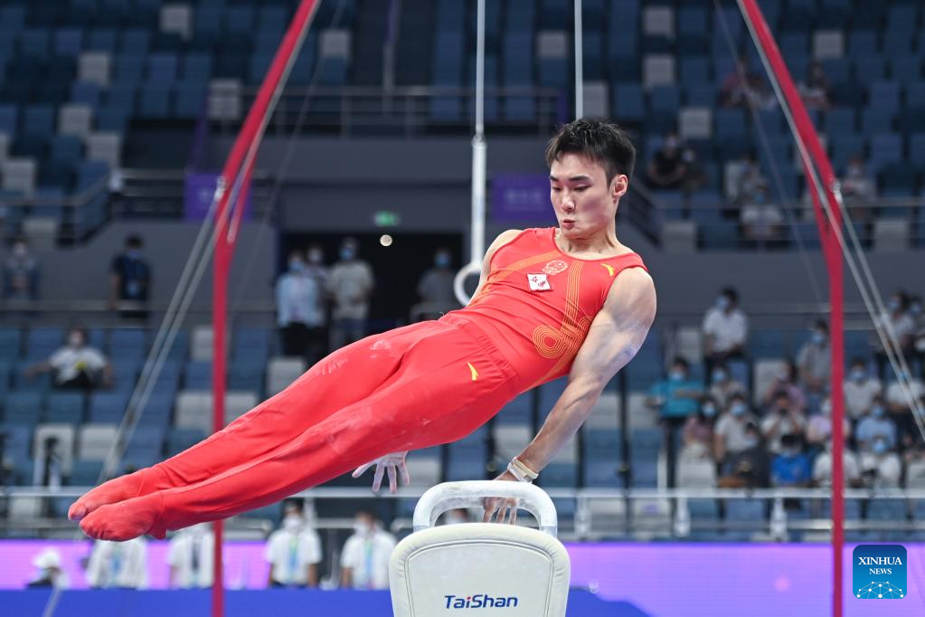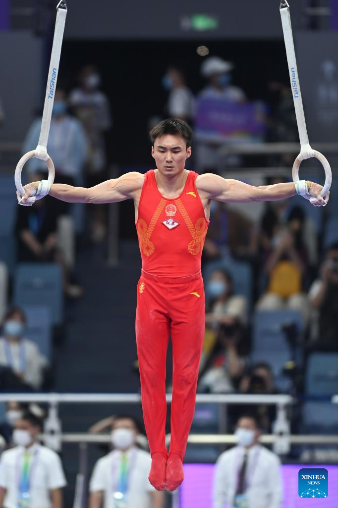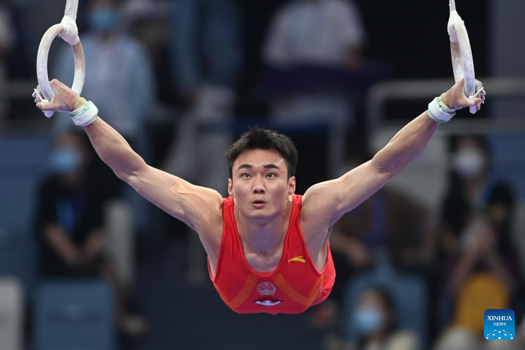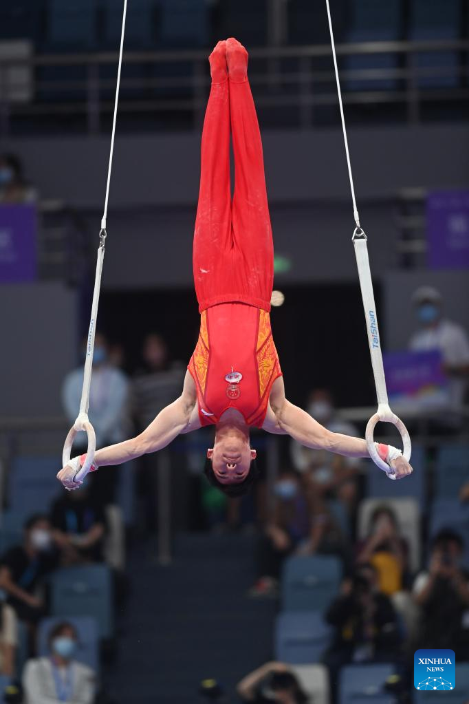 Silver medalist Sun Wei of Jiangsu competes during the rings of the artistic gymnastics men's all-around final at the National Artistic Gymnastics Championship in Hangzhou, east China's Zhejiang province, Sept. 6, 2022. (Xinhua/Huang Zongzhi)