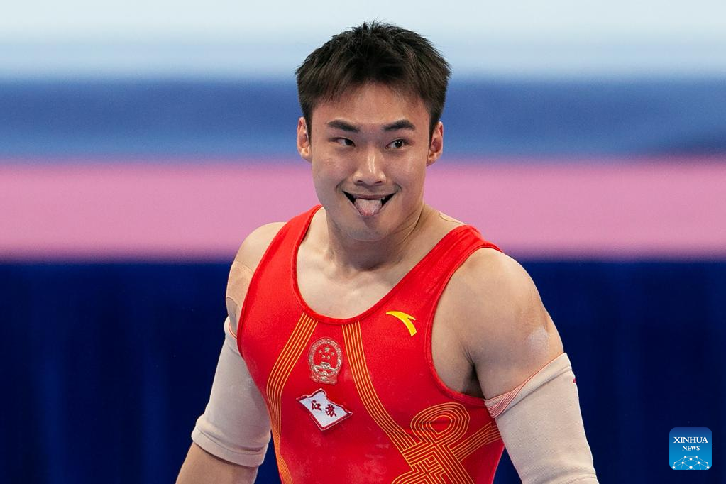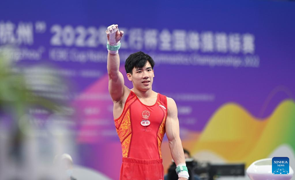 Gold medalist Zhang Boheng of Hunan celebrates after the artistic gymnastics men's all-around final at the National Artistic Gymnastics Championship in Hangzhou, east China's Zhejiang province, Sept. 6, 2022. (Xinhua/Huang Zongzhi)