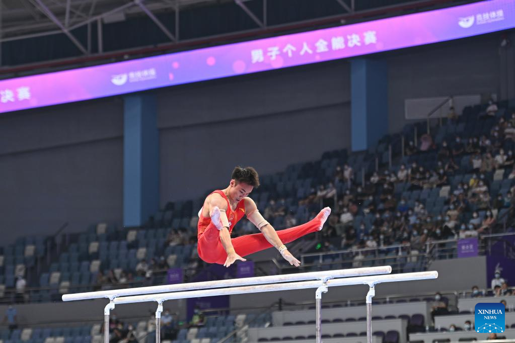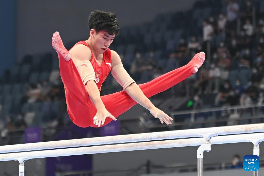 Gold medalist Zhang Boheng of Hunan competes during the parallel bars of the artistic gymnastics men's all-around final at the National Artistic Gymnastics Championship in Hangzhou, east China's Zhejiang province, Sept. 6, 2022. (Xinhua/Huang Zongzhi)