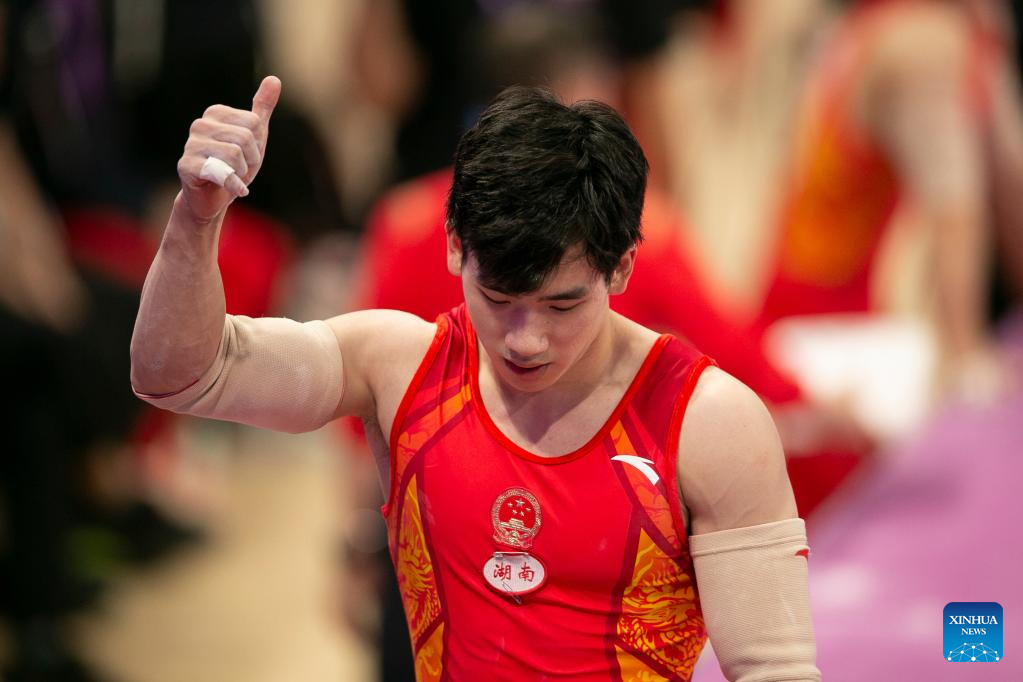 Gold medalist Zhang Boheng of Hunan celebrates after the parallel bars of the artistic gymnastics men's all-around final at the National Artistic Gymnastics Championship in Hangzhou, east China's Zhejiang province, Sept. 6, 2022. (Xinhua/Xu Yanan)