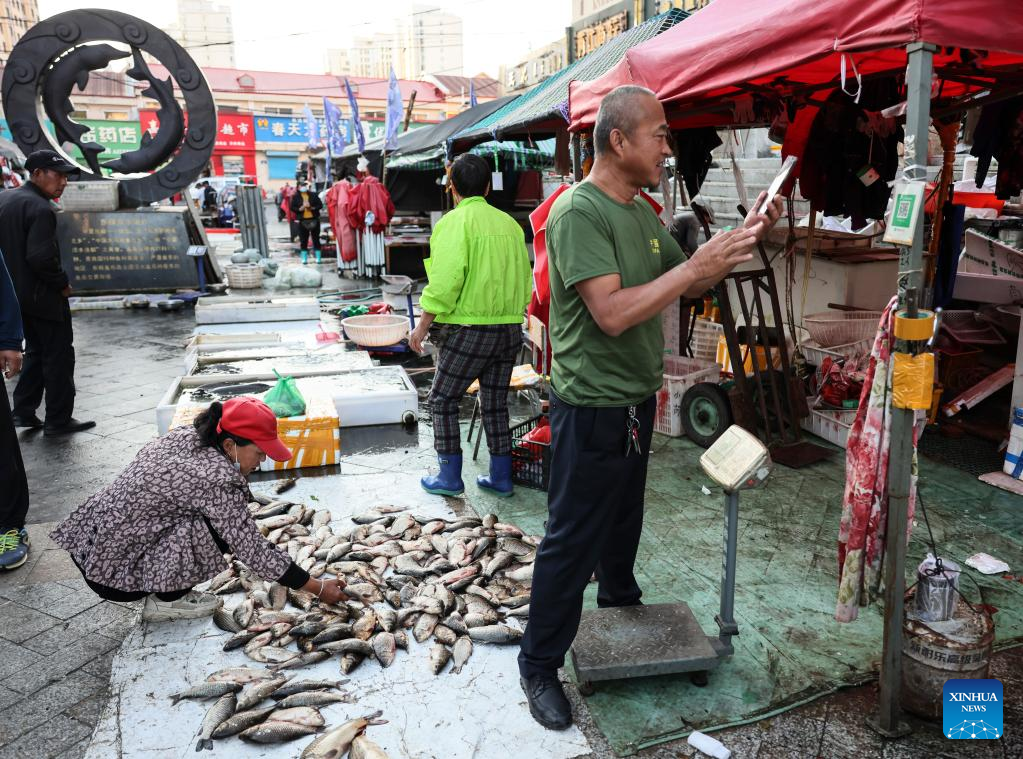A citizen scans a QR code for payment with mobile phone to buy fish at Dongji fish market, literally means the easternmost fish market, in Fuyuan City, northeast China's Heilongjiang Province, Sept. 4, 2022.