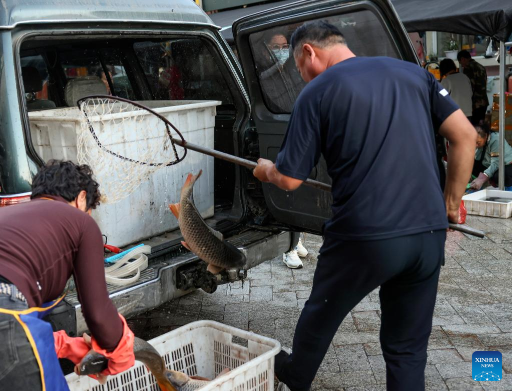 A vendor sells fish at Dongji fish market, literally means the easternmost fish market, in Fuyuan City, northeast China's Heilongjiang Province, Sept. 4, 2022.