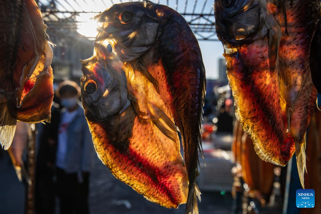 Photo taken on Sept. 4, 2022 shows dried fish at Dongji fish market, literally means the easternmost fish market, in Fuyuan City, northeast China's Heilongjiang Province.