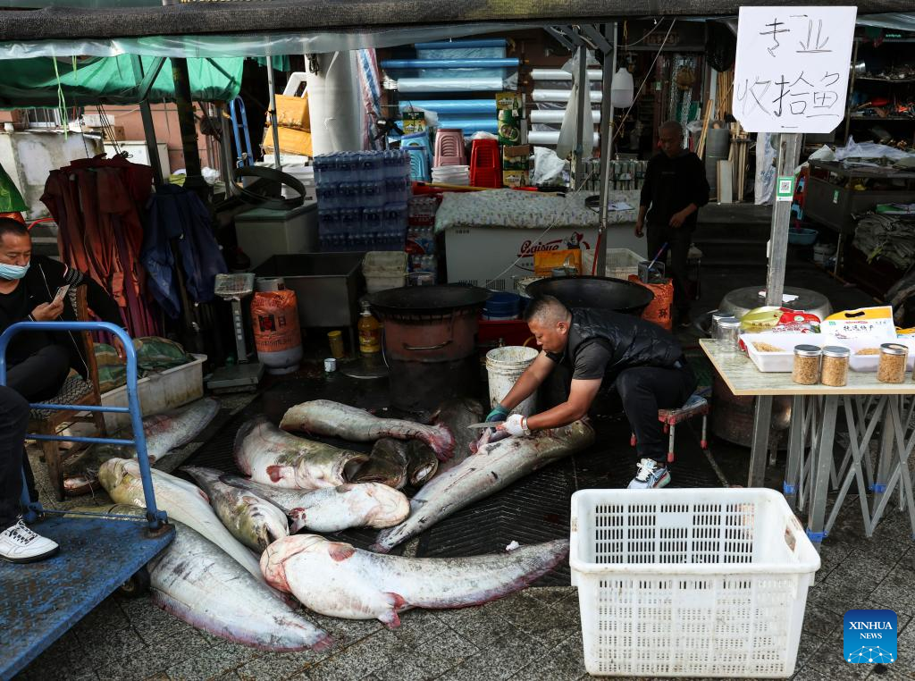 A vendor processes fish at Dongji fish market, literally means the easternmost fish market, in Fuyuan City, northeast China's Heilongjiang Province, Sept. 4, 2022.