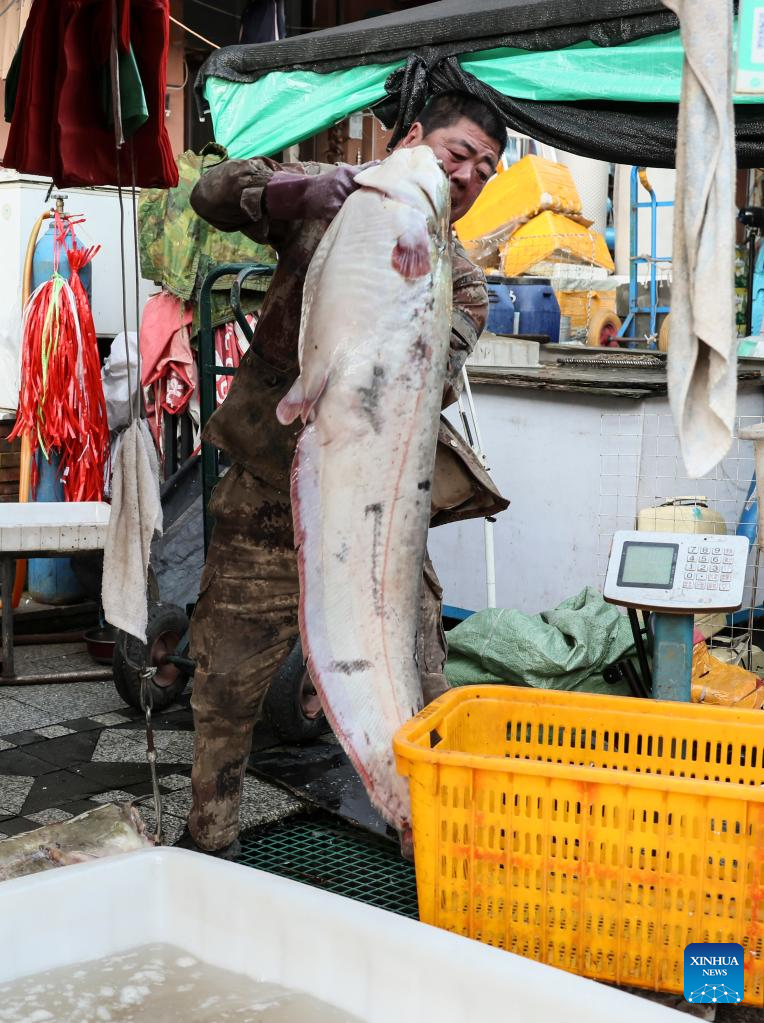A vendor carries a big fish at Dongji fish market, literally means the easternmost fish market, in Fuyuan City, northeast China's Heilongjiang Province, Sept. 4, 2022.