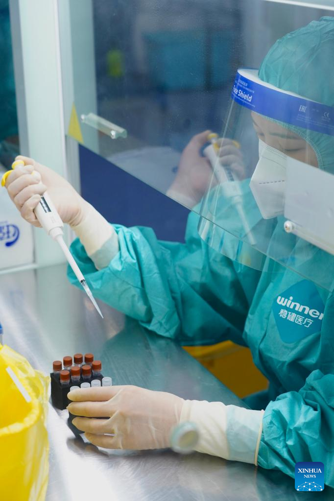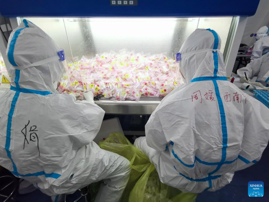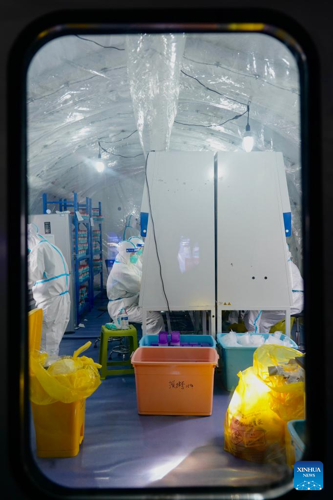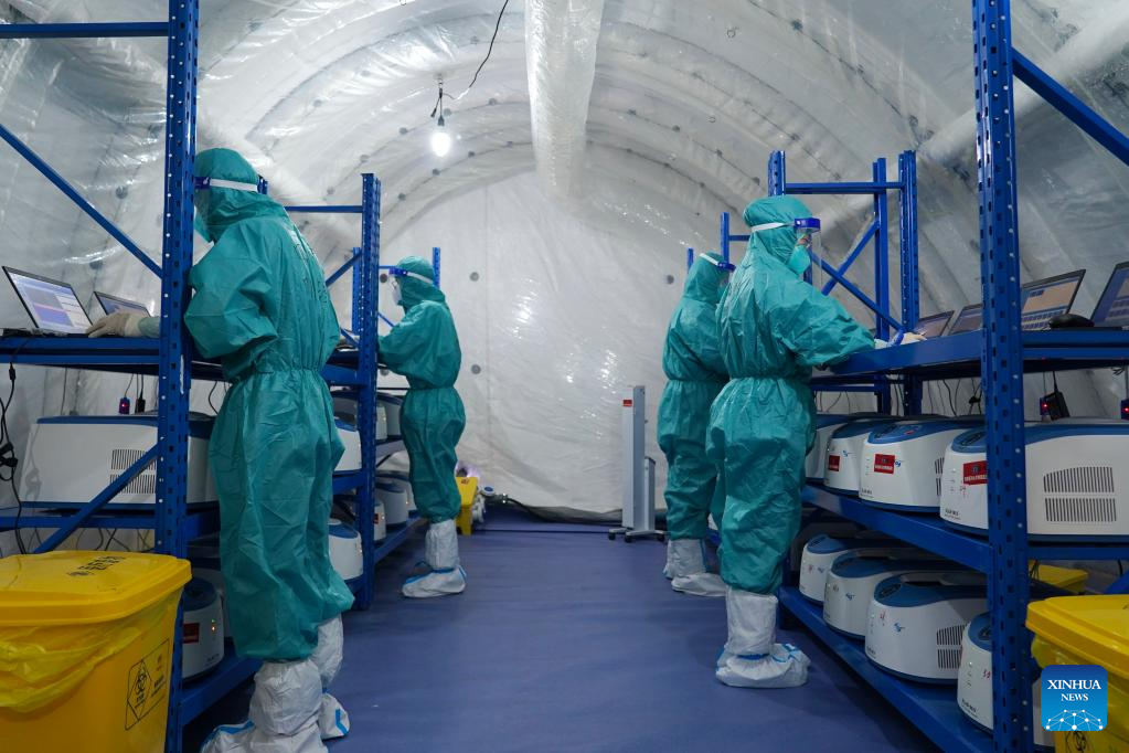 The city of Chengdu has built five air-inflated laboratories for COVID-19 nucleic acid testing, providing a daily maximum testing capacity of 250,000 tubes. (Xinhua/Liu Qiong)
