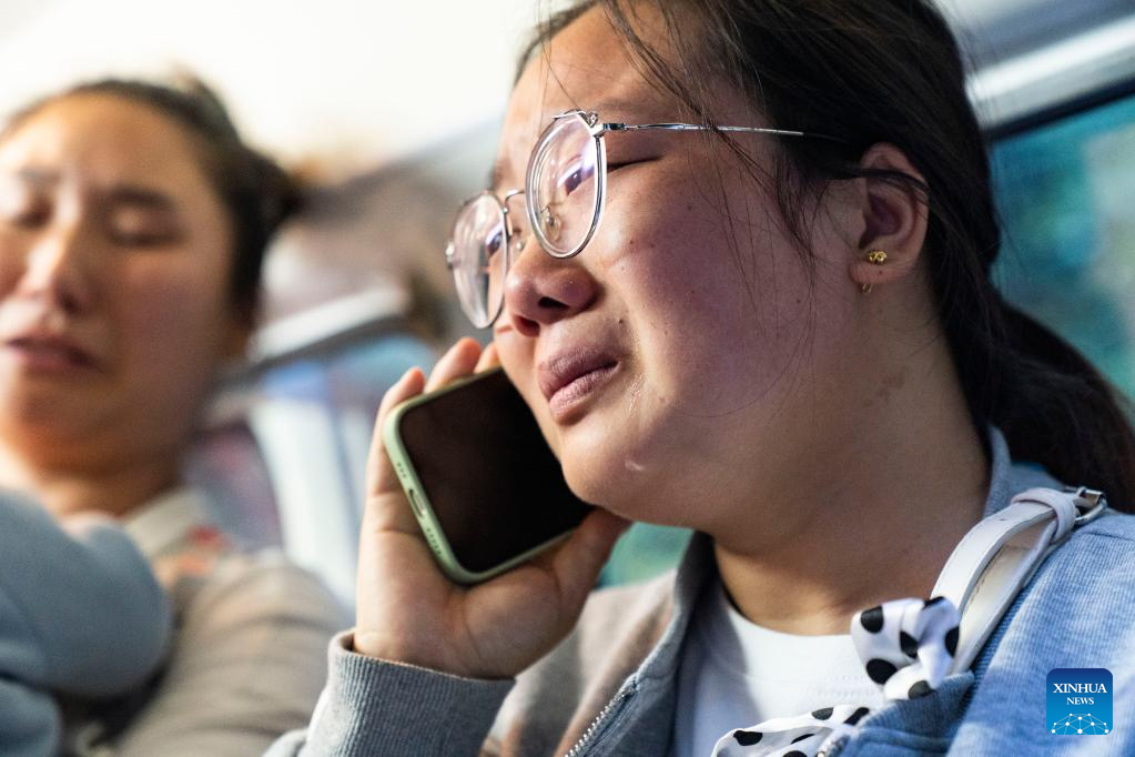 A quake-affected pregnant woman (R) who arrived here by a rescue helicopter reacts emotionally after calling her family in an ambulance in Shimian County of Ya'an City, southwest China's Sichuan Province, Sept. 6, 2022.