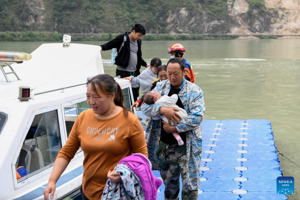 Villagers from Wanggangping Township are transferred to Xinmin Township in Shimian County of Ya'an City, southwest China's Sichuan Province, Sept. 6, 2022.