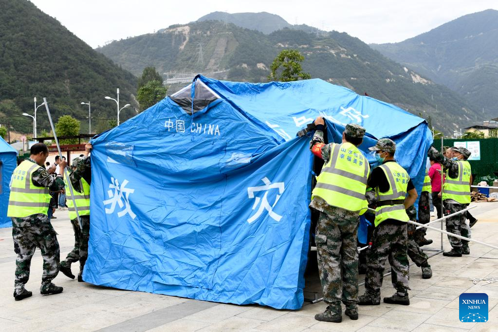 Rescue workers put up a tent at a quake relief shelter in Wajiao Village of Wanggangping Township in Shimian County of Ya'an City, southwest China's Sichuan Province, Sept. 6, 2022.