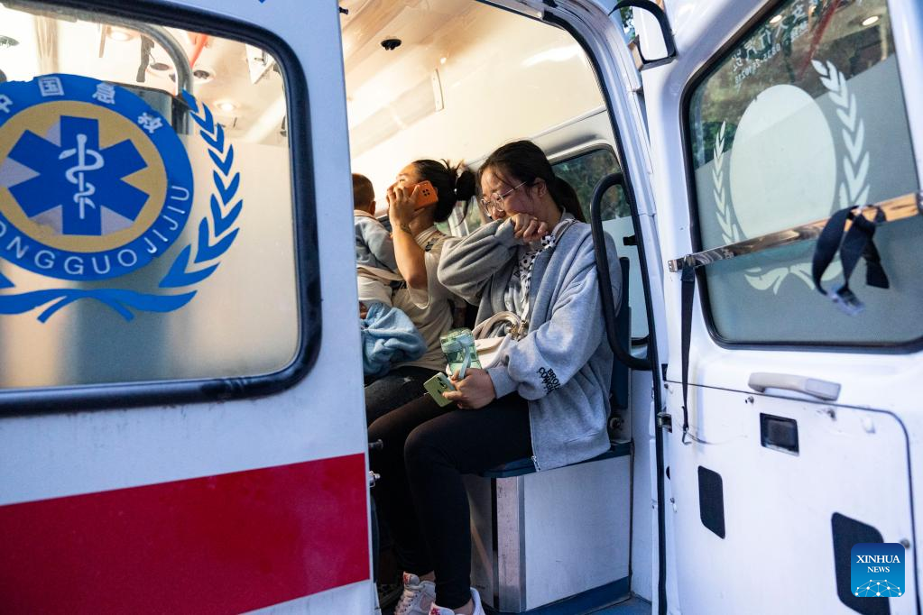 A quake-affected pregnant woman who arrived here by a rescue helicopter calls her family in an ambulance in Shimian County of Ya'an City, southwest China's Sichuan Province, Sept. 6, 2022.