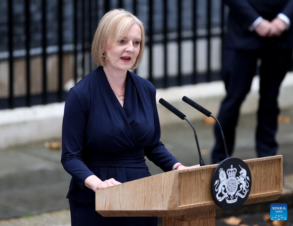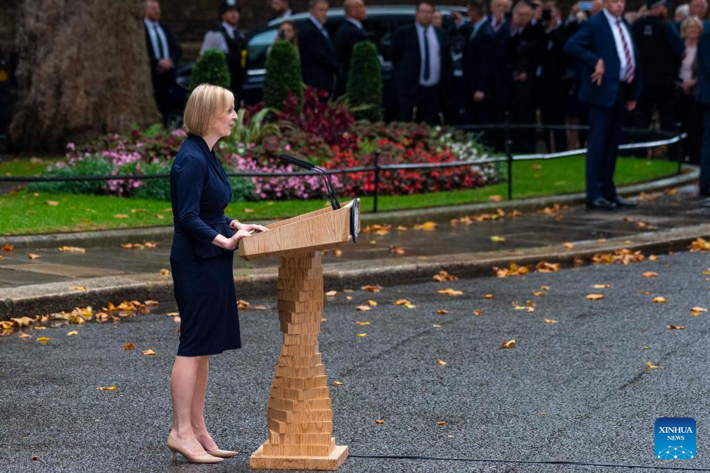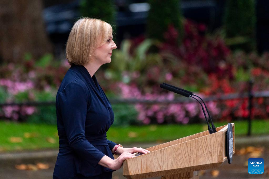 Britain's new Prime Minister Liz Truss delivers her first address to the nation outside 10 Downing Street in London, Britain, on Sept. 6, 2022. Britain's new Prime Minister Liz Truss said on Tuesday that she will prioritize economic growth, tackling the energy crisis and improving access to the health service. (Xinhua/Li Ying)